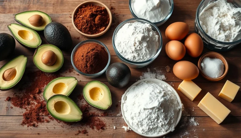 Para fazer o bolo de abacate com cacau, é crucial ter todos os ingredientes para bolo de abacate e os equipamentos certos. Isso evita problemas e garante um bolo delicioso e úmido.